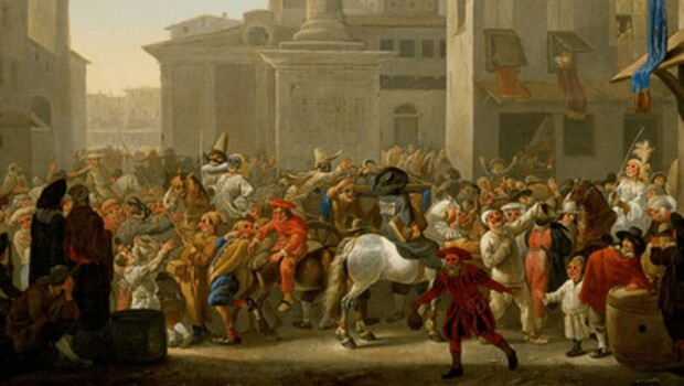Il Carnevale di Roma, “gran theatro del mondo”, si intreccia al mondo delle maschere e dei travestimenti ma anche alle gare dei cavalli, derivazioni dell’antica Equiria, la festa equestre che cadeva il 27 febbraio e si ripeteva poi quindici giorni dopo, dedicata in origine al dio Marte. E poi continuata nella Roma cattolica fino al principio dell’Ottocento, come ricordava anche Goethe nel suo Viaggio in Italia, con la gara dei cavalli prima tra il Testaccio e il Campidoglio e poi sulla via Lata, l’attuale via del Corso, da piazza del Popolo a piazza Venezia. Riti di passaggio dall’inverno alla primavera, come ricordava Alfredo Cattabiani.