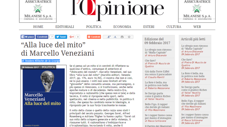 Dall’Eco di Bergamo, due interviste a Marcello Veneziani sul mito e sul suo rapporto con la nostra società nichilista. Il mito? Si è nascosto tra cellulari e spot Il nostro sembra un mondo disincantato, secolarizzato, in cui non c’è spazio per ricostruzioni immaginifiche ed emotivamente cariche. A 150 anni da Nietzsche respiriamo tutti una vasta [&hellip